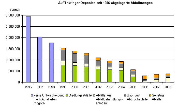 In den Jahren von 1996 bis 2006 verringerte sich die an Thüringer Deponien gelieferte Abfallmenge um rund 2,7 Millionen Tonnen bzw. 90,1 Prozent, was vor allem auf gesetzliche Änderungen bei der Abfallentsorgung zurückzuführen war. Danach durften ab Mitte 2005 nur noch vorbehandelte Abfälle auf Deponien verbracht werden, d.h. der größte Teil der Abfälle wird in Thüringen einer Verwertung zugeführt. Nur ca. 7 Prozent der jährlich erfassten Abfallmenge werden seitdem auf die Deponien des Freistaates verbracht.