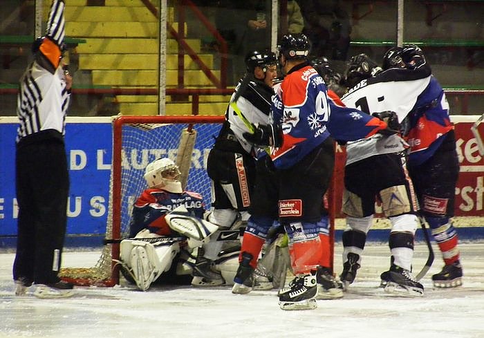 Auf dem Weg in die Kabine kam es anschließend zu Rangeleien zwischen Hoffmann und einigen Zuschauern, nachdem der Hallenser das Sicherheitspersonal der Wölfe unwirsch angegangen war. Im Hallenser Block zündeten einige Fans nun etliche bengalische Feuer und Rauchtöpfe und vernebelten das Stadion komplett, während sich auf dem Spielfeld die beiden Goalies für einen Kampf bereit machten, der vom Schiedsrichter allerdings unterbunden wurde.