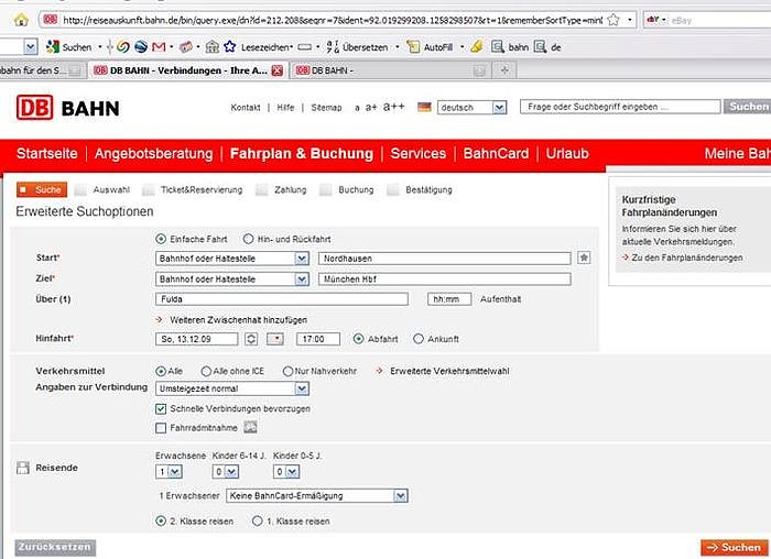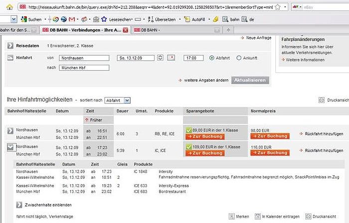 Für den 18.12.09 wird die 2. Klasse Fahrt München - Nordhausen eingegeben. Als Ergebnis kommt -wen wundert es- die Auskunft, dass diese Fahrkarten nicht mehr verfügbar seien. Stattdessen gibt es wieder ein Sparangebot der 1. Klasse, welches 109 EUR kostet. Nun heißt es wieder nachverhandeln: Die Reisenden geben anstatt Nordhausen als Reiseziel Halle (Saale) ein. Wie bei der Hinfahrt wird dem Link "weitere Angaben ändern - Aktualisieren" gefolgt.