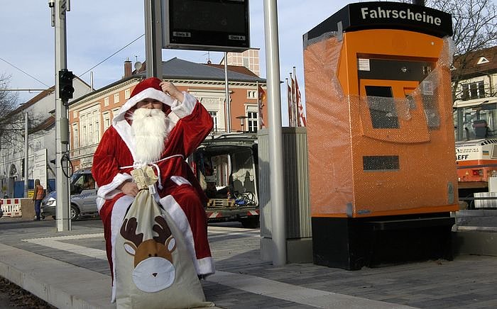 Also: Der Weihnachtsmann wartet an der Haltestelle Wiedigsburghalle bereits auf die erste Straßenbahn der Linie 2. Er hatte doch was läuten hören: Die Gleise und Fahrleitungen in der Grimmelallee sind verlegt, die Haltestellen sind fertig. Aber er ist einige Tage zu früh dran. Die erste Combino-Bahn rollt am 29. November, dem 1. Advent, um 13:30 Uhr durch’s rote Band. Die nnz hatte darüber bereits berichtet.