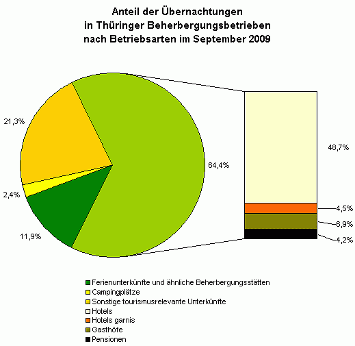 Die Thüringer Beherbergungsstätten (mit neun und mehr Betten) und die Campingplätze (ohne Dauercamping) konnten im September 2009 fast 337.000 Gäste begrüßen. Das waren nach Mitteilung des Thüringer Landesamtes für Statistik 5,1 Prozent mehr als im September 2008. Durchschnittlich verweilten die Besucher 2,6 Tage in Thüringen, so dass die Thüringer Tourismusbranche 885.000 Übernachtungen verzeichnen konnte. Damit wurde das Ergebnis des Vorjahresmonats um 3,1 Prozent überboten. In Deutschland stieg die Zahl der Übernachtungen nach vorläufigen Angaben des Statistischen Bundesamtes im Vergleich zum entsprechenden Vorjahresmonat um 1,0 Prozent auf 37,5 Millionen.