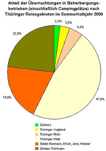 Im Sommerhalbjahr 2009 (Mai bis Oktober) betrug die Zahl der Übernachtungen in den Thüringer Beherbergungsstätten mit 9 und mehr Betten und auf Campingplätzen (ohne Dauercamping) 5,8 Millionen. Das waren nach Mitteilung des Thüringer Landesamtes für Statistik 2,3 Prozent mehr Übernachtungen als im Sommerhalbjahr 2008. Die Zahl der Gäste stieg auf 2,1 Millionen (+ 2,0 Prozent).
