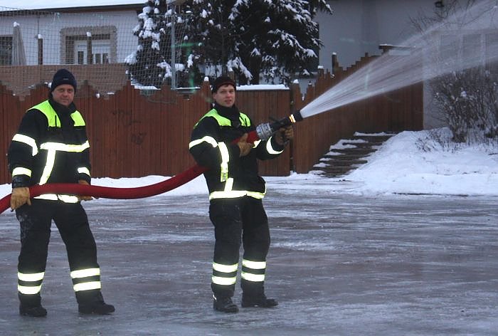 Autor: nnzFrank Lawrenz und Roland Gräser (rechts) von der Berufsfeuerwehr beim Fluten der Eiswiese