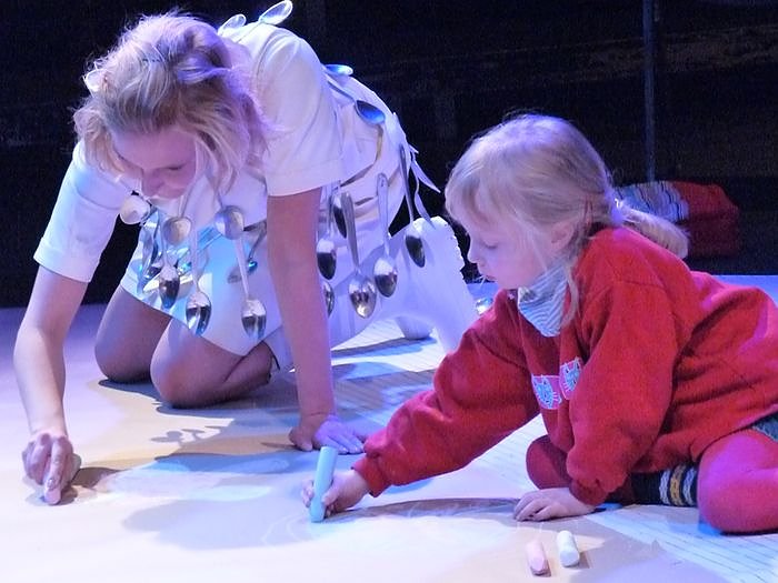 Da Kinder in diesem Alter ganz andere Bedürfnisse von Erzählstrukturen haben, verzichten wir auf vorgetragenen Text und konzentrieren uns auf das Erzählen der Geschichte durch Musik, Körperlichkeit und Licht", erklärt Bianca Sue Henne. Dazu präsentiert sich das Theater unterm Dach nicht wie gewohnt mit Stühlen und Bühne, sondern die Zuschauer sitzen sozusagen mitten im Geschehen. Und sie dürfen sogar mitmachen. Den kleinen Besuchern ist es erlaubt, herumzulaufen, rauszugehen und wieder reinzukommen. Und eh man sich versieht, ist die Zeit mit der Königin der Farben auch schon vorbei. Um die Aufnahmefähigkeit der jungen Besucher nicht zu überstrapazieren, dauert das Stück nur etwa 40 Minuten.