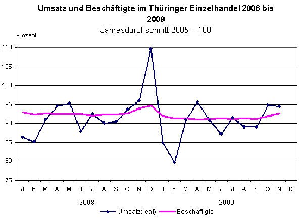Für den Zeitraum der ersten elf Monate 2009 steht für den Thüringer Einzelhandel ein Umsatzrückgang von real 1,5 Prozent und nominal 1,9 Prozent zu Buche. Im gleichen Zeitraum gingen die Beschäftigtenzahlen um 1,2 Prozent zurück. Der Rückgang der Beschäftigtenzahlen bei Vollzeitbeschäftigten (- 2,0 Prozent) war deutlich stärker ausgeprägt als der Rückgang bei Teilzeitbeschäftigten (- 0,7 Prozent).