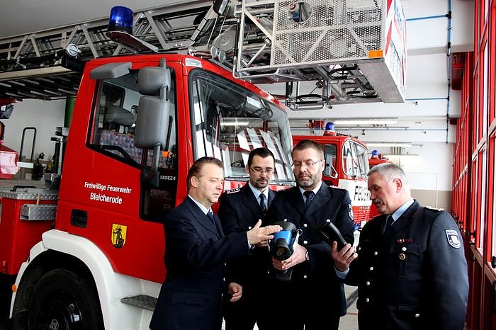 Autor: nnzKreisbrandinspektor Wilfried Ittershagen mit stell. Wehrführer Marcel Steinecke, Ordnungsamtsleiter Burkhard Keil und Wehrführer Wolfgang Werkmeister von der FFW Bleicherode mit der Wärmebildkamera
