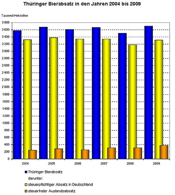 Im Jahr 2009 wurden von den Thüringer Brauereien und Bierlagern 3,7 Millionen Hektoliter Bier abgesetzt. Das waren nach Angaben des Thüringer Landesamtes für Statistik 203.000 Hektoliter bzw. 5,8 Prozent mehr als 2008. Thüringen hat damit die beste Entwicklung aller Bundesländer zu verzeichnen. Bundesweit sind die Zahlen rückläufig. 2009 wurden mit 100 Millionen Hektoliter 2,8 Prozent (-2,9 Millionen) weniger Bier abgesetzt als noch ein Jahr zuvor.