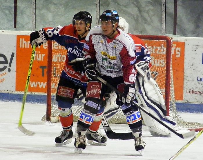 Werden in der Defensive gefordert sein: Die Harzer Wölfe um Goalie Mario D'Antuono (verdeckt) und Sven Eichler (blau), hier in einer Szene aus dem Vorrundenspiel beim Duell mit Rostocks Vasilij Sharapa (weiß)
