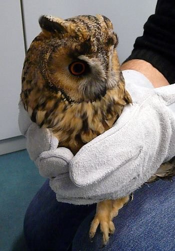 Die Eule war wohl auf der Flucht vor Krähen vor die Scheibe eines Klassenzimmers geflogen und ist dann in die Büsche vor dem Gebäude gefallen. Eine Schülerin kam ganz aufgeregt zu mir gelaufen und meinte, da draußen liege ein toter Vogel, aber er habe den Kopf noch bewegt, erzählt Lehrerin Steffi Ibe. Schnell haben einige Lehrer und Schüler sich um das Tier gekümmert und einen der großen Kartons geholt, die im Flur schon für den Umzug in das neue Schulgebäude bereitstehen. Der 12-jährige Felix hat die benommene Eule mit gefunden und hat sie in seinen Schal eingewickelt und in den Karton gehoben: Ich hab noch nie eine Eule so nah gesehen, freut sich Felix. Nun fragten sich die Lehrer und Schüler: Was tun? Sie riefen in der Unteren Naturschutzbehörde im Nordhäuser Landratsamt an. Rolf Schiffler und Matthias Piontek holten die Waldohreule ab und nahmen sie in ihre Obhut.