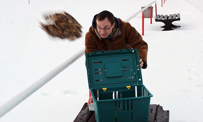 Für solche Fälle steht in der Unteren Naturschutzbehörde eine große Kiste bereit, in der Rosalie vorübergehend einen Schlafplatz gefunden hat und sich ausruhen konnte. Wir haben ihr noch etwas zu fressen gegeben, zwei Küken aus unserem Notfallvorrat, so Matthias Piontek. Nach einer Nacht in der Naturschutzbehörde waren die Küken weg ein gutes Zeichen. Die Waldohreule hatte sich offenbar nicht ernstlich verletzt und die Naturschützer merkten rasch am Verhalten des ausgewachsenen Tieres, dass es zurück in die Freiheit wollte.