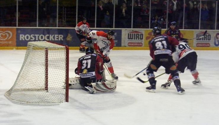 Wölfe-Stürmer Stefan Bilstein (mitte, weiß) scheitert in dieser Szene an Rostocks Goalie Tobias John. Nach Spielende durften aber doch die Harzer über den unerwarteten Auswärtssieg jubeln.