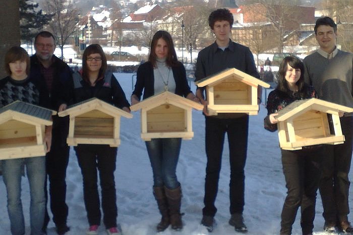 Ein erster praktischer Grundstein für den perspektivisch angedachten, von Gymnasiasten wissenschaftlich betreuten Wanderpfad über die Halde wurde in der vergangenen Woche gesetzt. Im Beisein ihres stellvertretenden Schulleiters Thomas Gaßmann übergaben Schüler/innen der 10.Klassen Vogelhäuschen an den Vertreter der NDH-E, Herrn Stude.