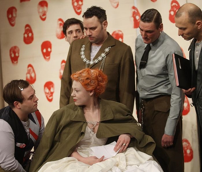 Regisseur Carlos Manuel und sein Ausstatter Vinzenz Gertler stellen die beiden Hauptdarstellerinnen Anne Kies (Maria Stuart) und Ewa Rataj (Elisabeth) mit ihren Kleidern aus 20 Metern Stoff auf eine von Totenköpfen umrahmte Bühne. Da der Ausgang des Stückes von Anfang an klar ist, liegt das Hauptaugenmerk der Inszenierung auf den privaten Interessen und politischen Schachzügen der einzelnen Figuren.