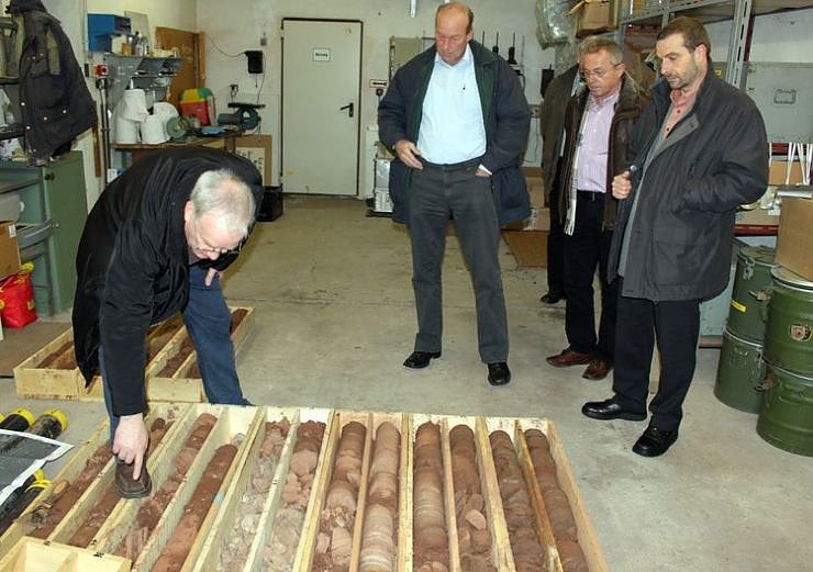 Die Bohrungen haben bislang eine ganz normale Schichtenabfolge gezeigt, so Konrad Rose. In 16 Meter Tiefe hat der Buntsandstein die Kiesschichten abgelöst. Darunter lagert der Gips des Zechsteins, allerdings ist unklar, in welcher Tiefe der Gips beginnt. Auffällig an den bisherigen Bohrkernen sind die Meter 16 bis 22. Hier gibt es eine Zwischenkiesschicht im Buntsandstein, so Konrad Rose. Auch die Struktur des Buntsandsteins weiche in dieser Tiefe von der normalen ab. Das deutet darauf hin, dass es hier vielleicht vor mehreren 10.000 Jahren zu Bewegungen, Verwerfungen gekommen ist.