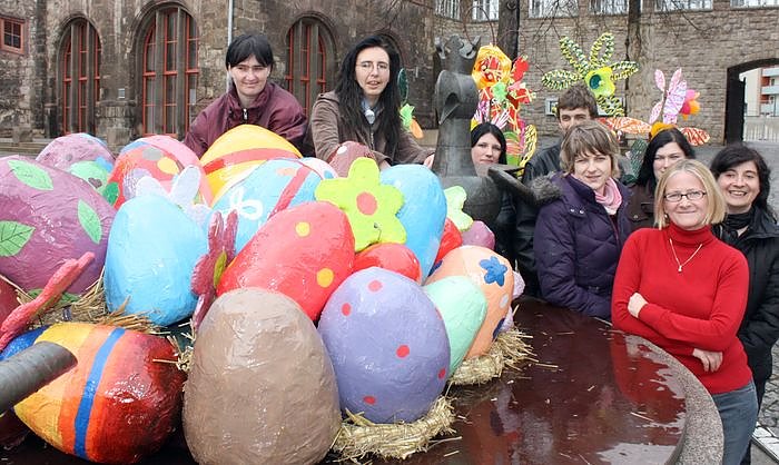 Autor: nnzPünktlich zum Osterfest schmückten heute 11 Teilnehmer einer geförderten Arbeitsgelegenheit um Floristenmeisterin Sabine Stiedenroth vom VHS-Bildungswerk (vorn links) und Heike Münch vom Gartenamt der Stadtverwaltung (vorn Mitte) den Rathaus -Brunnen als großes Osternest.