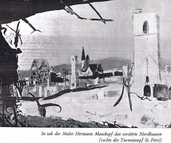 Der Künstler Hermann Manskopf stammt aus Siegen (1913-1985) und weile einige Zeit in unserer Region. Es entstanden damals einige Landschaftsgemälde, darunter auch das vom zerstörten Nordhausen.