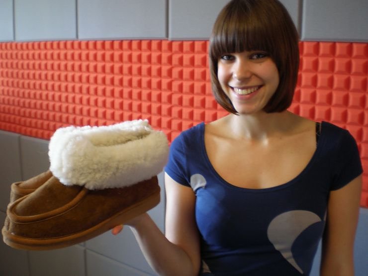 OKN-Mitarbeiterin Laura Huß präsentiert die eigens für das neue Studio angeschafft raumakustischen Spezialschuhe, die den Radiomachern zur Verfügung gestellt werden.