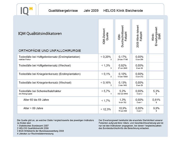 Die Klinik nutzt das IQMVerfahren für die laufende Qualitätskontrolle und um trägerübergreifend mit Experten anderer Kliniken Verbesserungen umzusetzen. Durch die Veröffentlichung unserer Werte stellen wir uns dem Qualitätswettbewerb. Ziel ist es, unseren Patienten die bestmögliche Qualität in der medizinischen Versorgung zukommen zu lassen, erklärt Gudrun Bartl, Verwaltungsleiterin der Bleicheröder Klinik. Deshalb sind wir der trägerübergreifenden Initiative beigetreten. Die IQM-Werte belegen die Stärken der Klinik im Gelenkersatz. So hatten wir bei 395 Hüftgelenkersatzoperationen und bei 401 Kniegelenkersätzen keinen Todesfall, erläutert die Ärztliche Direktorin, Dr. Hertha Ratayski. Hier konnten wir nahtlos an unsere Ergebnisse aus dem Jahr 2008 anknüpfen.