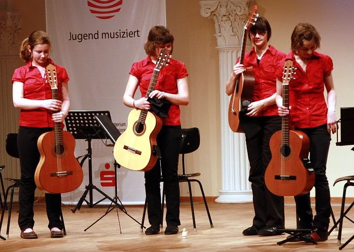 16.00 Uhr: Ein letztes "Toi,toi, toi !" und die Gitarristinnen betreten den Saal. Nun sind sie auf sich allein gestellt und wollen beweisen, dass die letzten Monate des gemeinsamen Übens Früchte getragen haben. Im Zuschauerraum sitzt der Fanblock und hält das Maskottchen. Die ersten Töne erklingen und die Jury lehnt sich entspannt zurück. Mit Klängen von Johann Sebastian Bach finden die vier Mädchen zu ihrer inneren Ruhe zurück. Sie musizieren mit Spannung und Esprit. Mutig gehen sie an die schwierigen Passagen.