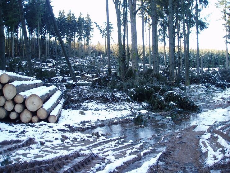 Nach dem der Schnee getaut war, ging es um die Aufarbeitung der Schadbäume, es waren vor allem Einzelwürfe und –brüche. Am Ende kamen doch ein paar tausend Festmeter Schadholz, vornehmlich Fichte, zusammen. Einzelbrüche sind sehr aufwendig in der Aufarbeitung und Rückung.