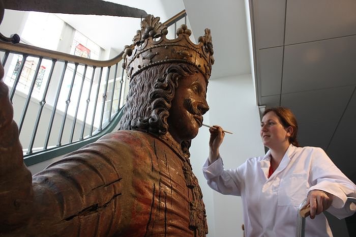 Der Original-Roland im Neuen Rathaus putzt sich für sein Fest am kommenden Wochenende. Diplom Restauratorin Suzy Hesse wurde jetzt von der Stadtverwaltung beauftragt, den Roland fachgerecht zu reinigen. Mit Pinsel und speziellem Reinigungsschwamm rückt die Restauratorin heute dem Staub zu Leibe.