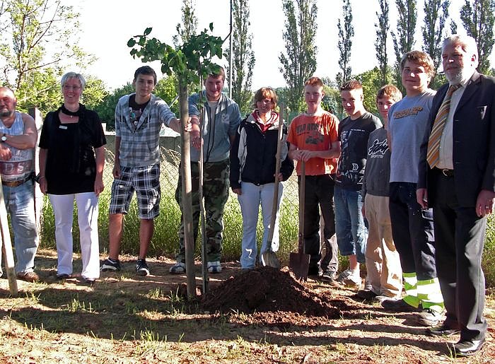 Jörg Lorenz, Direktor der Schule (nicht im Bild) gab seinen Schülern in seinen kurzen Worten mit auf den Weg, dass auch sie - wie diese Winterlinde und der gepflanzte Ginko-Baum auf dem Gelände der Schule - ihr weiteres Leben resistent gegenüber allen Einflüssen von außen meistern sollten. Weitere Bäume sollen noch auf dem Sportplatz und im Freibad gepflanzt werden.