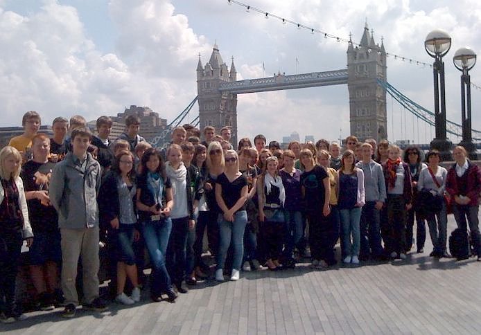 "Vom 13. bis 18. Juni machten wir London unsicher. All der Stress, all das harte Arbeiten für das Bestehen der BLF sollten nun mit fünf aufregenden Tagen in der Großstadt belohnt werden. Dafür nahmen wir sogar frühes Aufstehen am Sonntagmorgen und eine fünfzehnstündige Busfahrt durch halb Europa in Kauf. Trotz Müdigkeit kam der Spaß auf der Fahrt nicht zu kurz, auch Dank unseres tollen Busfahrers Oli, der uns den Rest der Woche sicher von einer Sehenswürdigkeit zur anderen brachte. Dass London eine Menge Sehenswertes zu bieten hat, stellten wir schon bei der Stadtrundfahrt fest. Unsere Stadtführerin hatte besonders viel Humor, denn für sie war Mc Donalds beispielsweise die Botschaft Amerikas in London.