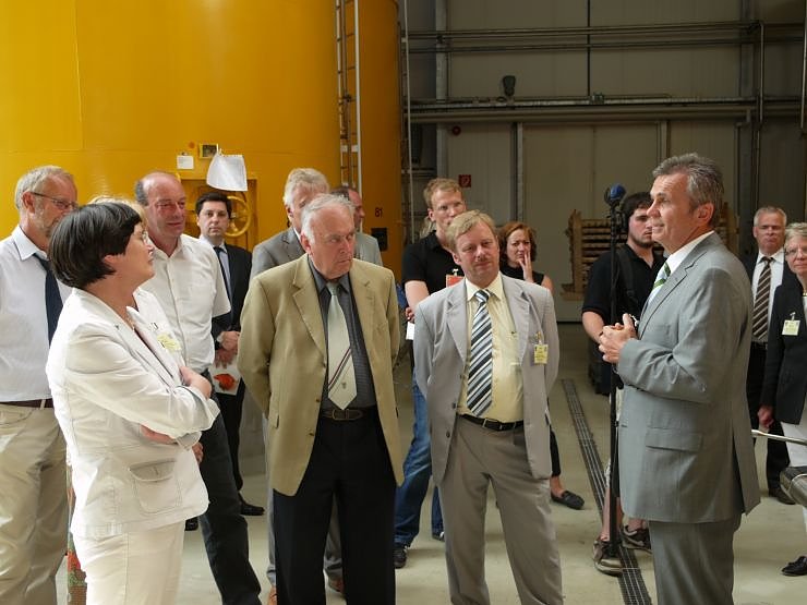Autor: aglIm Vergleich zum Besuch der letzten Woche war der (Medien-)Tross heute deutlich umfangreicher, hatten sich doch gleich zwei Ministerpräsidenten in Nordhausen angekündigt. Christine Lieberknecht hatte ihren Amtskollegen aus dem Nachbarstaat Sachsen-Anhalt mitgebracht. Nach einer nicht unerheblichen Verspätung der beiden Ministerpräsidenten erreichten am späten Nachmittag beide das Nordbrand-Gelände und besichtigten zügigen Schrittes die Werkshallen.