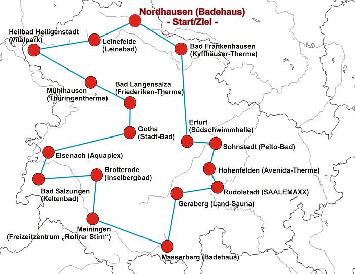Von Nordhausen führt es die Teilnehmer, übrigens im Alter von 30 bis 56 Jahre, über Leinefelde, Heiligenstadt, Mühlhausen, Bad Langensalza, Gotha, Eisenach, Brotterode, Bad Salzungen. Meiningen, Masserberg, Geraberg, Rudolstadt, Hohenfelden, Erfurt und Bad Frankenhausen. Endstation ist das Nordhäuser Badehaus. Mit einem Aufguss im Saunabereich des Badehauses wird der erste Thüringer Saunamarathon nach insgesamt 18 Saunagängen, 4,5 Stunden Schwitzen und 585 km am 22. August beendet.
