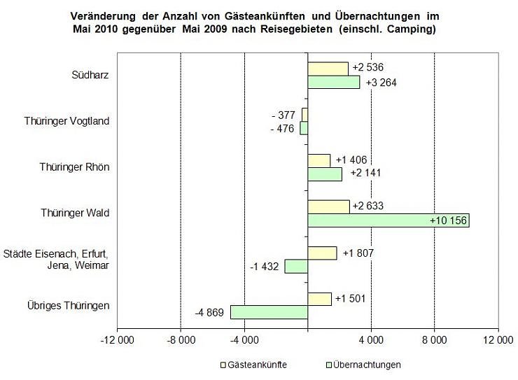Drei der sechs Thüringer Reisegebiete verzeichneten im Mai 2010 sowohl einen Anstieg der Gästeankünfte als auch der Übernachtungen. Die größten absoluten Zuwächse erzielte der Thüringer Wald. Hier stieg die Anzahl der Gästeankünfte im Vergleich zum Vorjahresmonat um 2 633 auf fast 142 Tausend (+ 1,9 Prozent), die Zahl der Übernachtungen erhöhte sich um 10 156 auf 423.000 (+ 2,5 Prozent). Einen wichtigen Beitrag zur positiven Entwicklung im Thüringer Tourismus lieferten ebenfalls die deutlichen Zuwächse in den Reisegebieten Südharz und Thüringer Rhön.