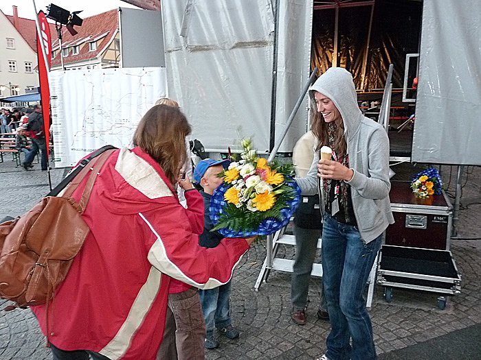 Einen kleinen Wermutstropfen aber gab es, Speerwurfeuropameisterein Linda Stahl reist erst morgen direkt zum Meeting auf den Göldner an. Für die Athletenpräsentation kam er zwar nicht mehr rechtzeitig, aber Kugelstoßer Ralf Bartels war später noch auf dem Markt und gab jede Menge Autogramme.