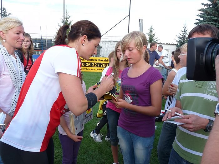 Auch Linda Stahl schrieb immer wieder geduldig Autogramme, da sie immer dicht umringt von zahlreichen Fans war die ihr die Programmhefte reichten. Knapp eine Woche nach ihrem Sieg in Barcelona trat sie in Sondershausen an und gewann mit 58,97 Meter beim Sparkassen-Meeting in Sondershausen. Ich bin das vierte Mal in Sondershausen und komme immer wieder gern hierher, sagte sie in einem Interview.