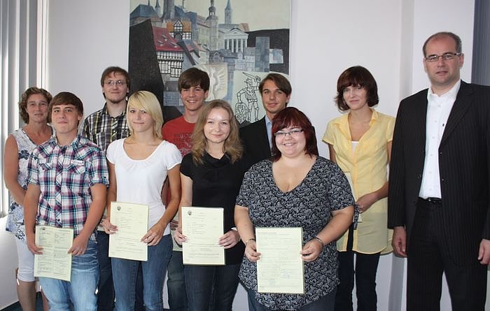 Trotz der derzeit vielen freien Ausbildungsplätze in Deutschland kann sich die Stadt immer noch ihre Auszubildenden aus einer Anzahl von 267 Bewerbern aussuchen. Das sagte heute Bürgermeister Matthias Jendricke (SPD) bei der Übergabe der Ausbildungsverträge für die neun neuen Auszubildenden im Nordhäuser Rathaus.
