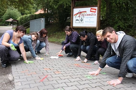 Dorthin brachen auch die fleißigen Helfer der Rothleimmühle, des Landratsamtes und des Hauses der Kinder auf und schlossen dann den Kreis zum Jugendgäste- und Bildungshaus. Zum Glück spielt das Wetter einigermaßen mit”, klang es aus der Gruppe. Wir möchten doch, dass die bunten Schriftzüge Toleranz, Respekt” und Vielfalt tut gut” und die vielen Hand- und Fußabdrücke solange wie möglich auf den Gehwegen zu sehen sind.”