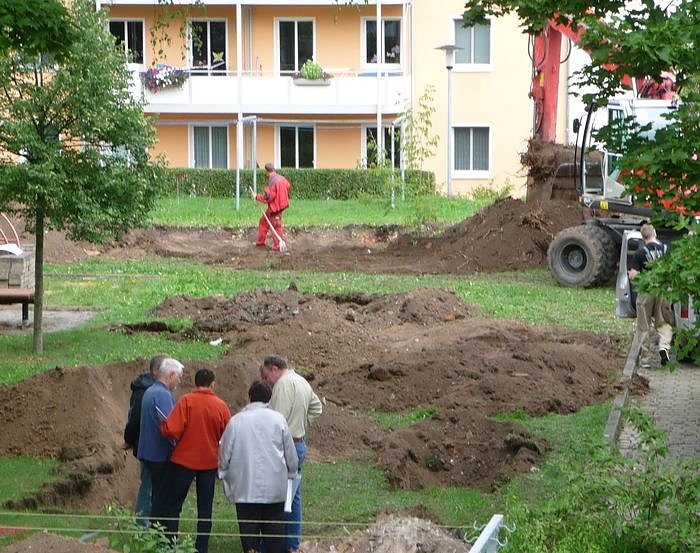 Ebenso ist der im Westteil des Hofes liegende Kinderspielplatz bei der Planung berücksichtigt worden. Der Spielplatz grenzt einseitig an den Anwohnerparkplatz und wird durch Begrünung und einen Zaun von diesem abgegrenzt, so dass die Kinder ungefährdet spielen können. Die Benutzung des Parkplatzes wird ausschließlich den vertraglichen Nutzern vorbehalten sein. Eine starke Frequentierung wie bei einer öffentliche Nutzung ist also nicht zu erwarten. Nach Fertigstellung der Straßenbauarbeiten wird im Herbst die Bepflanzung, einschließlich der Ersatzpflanzung für die entfernten Sträucher und Bäume, erfolgen."