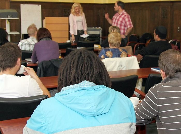 Oliver Genzel und Angela Hummitzsch von Horizont klären gemeinsam mit den Gemeinnützigen wie beispielsweise dem LV Altstadt, der Jüdischen Gemeinde, der Sportjugend oder Mobilé ab, welchen Bedarf an Leistungen sie in diesem Jahr haben. Nach dieser Analyse werden in den kommenden Wochen die möglichst passenden Unternehmen angesprochen. Mit dabei sind heute auch Studierende der Fachhochschule, die auf dem Marktplatze in die Rolle der Makler schlüpfen und den Akteuren dabei helfen werden, den passenden Tauschpartner zu finden.