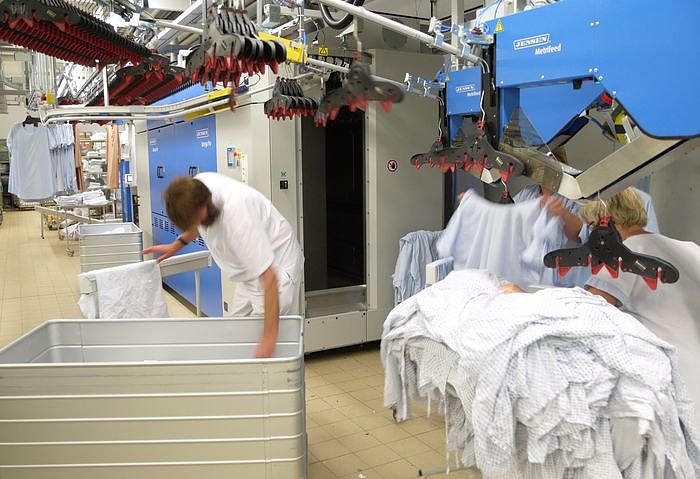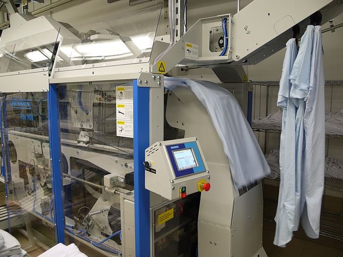 Und das geht so: Aus den riesigen Waschmaschinen wird die feuchte Wäsche auf Automatenkleiderbügel gehangen, dann geht es ab in den Finischer. Zuerst werden darin die Kleidungsstücke getrocknet und geglättet. Danach erkennt der Faltautomat, ob es sich um eine Hose, einen Op-Kittel oder einen Kasack handelt. Entsprechend wird diese Wäsche gefaltet und gestapelt.
