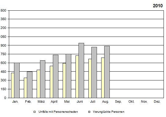 Deutlich verringert haben sich die Unfälle mit Personenschaden um 10,0 Prozent auf 4 461 Unfälle. Bei diesen Unfällen kamen 76 Verkehrsteilnehmer ums Leben, 21 Menschen weniger als von Januar bis August 2009. Auch die Zahl der Verletzten ging um 9,7 Prozent auf 5 792 zurück.