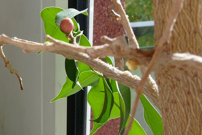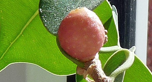 Eine Blüte will der Leser allerdings nicht bemerkt haben. Der Blick in die "allwissende" Wikipedia zeigt dort nur eine grüne Frucht, mit dem Hinweis, dass die reifen Feigen (Sammelfrucht) orange-rot sind und einen Durchmesser von 2 bis 2,5 cm besitzen. Ins Orangene geht der Knubbel schon aber mit einem Durchmesser von 8 mm und einer Länge von 10 mm bleibt das Gebilde doch etwas klein. Gewachsen ist es in den letzten zwei Wochen auch nicht mehr.