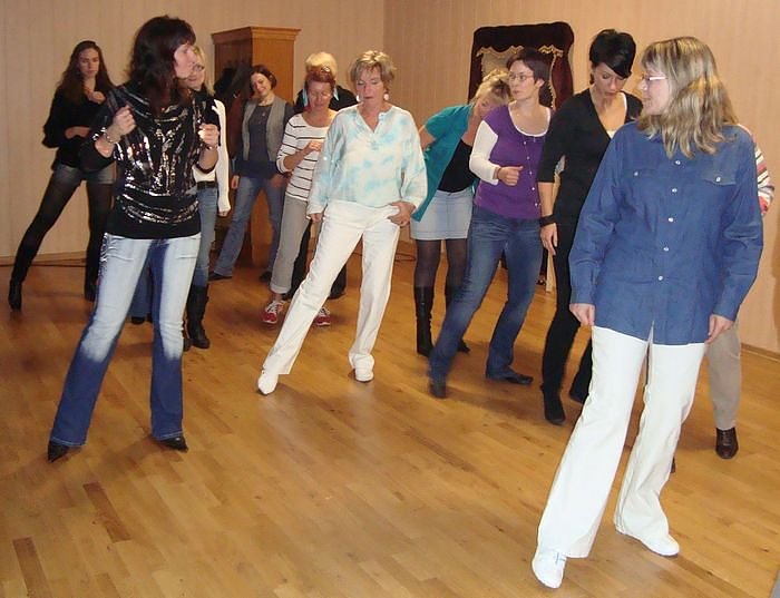 Natürlich hätte man sich getreu den Klischees mit Bi- und Trizepsübungen begnügen können. Der Griff in die Kleenex-Box zum Film wäre da schon genug gewesen. Aber die Organisatorinnen hatten da anderes im Sinn. Während sich zunächst alle am Buffet stärken konnten, zeigten Baby und Johnny im Film noch einmal, wie das Original ausschaut. Danach jedoch mussten die Frauen ran. Kleidung aus den 80ern war zur Pflicht gemacht worden, so dass alle stilecht das Tanzbein und die Hüften anzüglich schwingen konnten. Nur auf die legendäre Hebefigur musste mangels maskuliner Unterstützung verzichtet werden. Trotzdem wurde es für alle Beteiligten ein schöner und bewegter Abend.