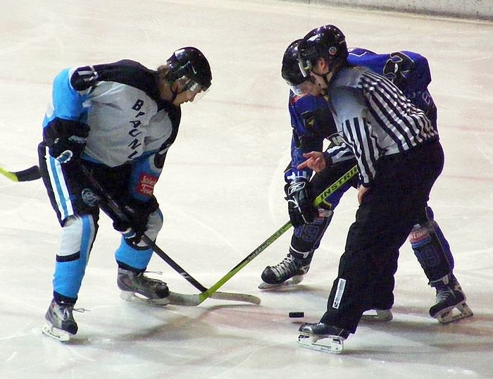 Autor: nnzGeht mit seiner Mannschaft in ein kräftezehrendes Wochenende: ESC-Spielertrainer Marc Garthe (links) beim Bully im Spiel bei den Wedemark Scorpions