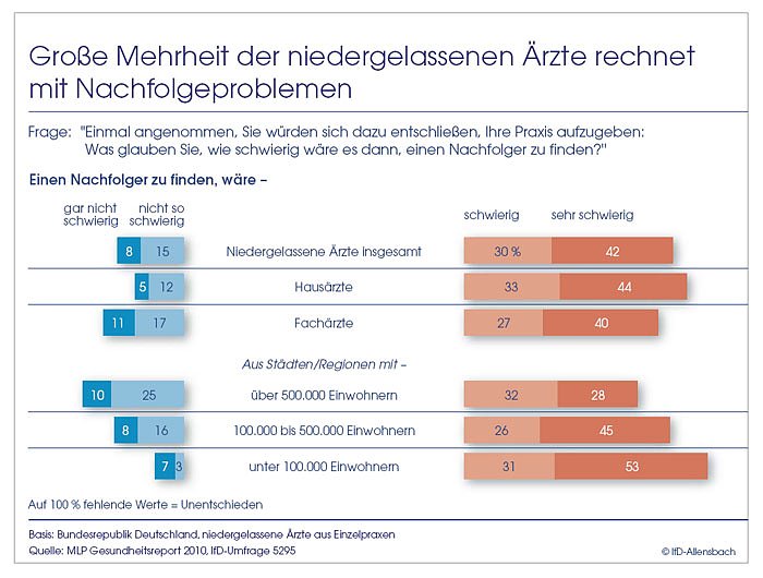 Die Befürchtungen über einen zunehmenden Ärztemangel kommen auch darin zum Ausdruck, dass die große Mehrheit der niedergelassenen Ärzte die Aussichten, im Fall einer Aufgabe der eigenen Praxis einen Nachfolger für die Übernahme zu finden, problematisch einschätzt, unabhängig davon, ob aktuell entsprechende Überlegungen bestehen. 72 Prozent der niedergelassenen Ärzte rechnen mit Problemen, einen Nachfolger zu finden, 42 Prozent sogar mit außerordentlichen Schwierigkeiten. Die Hausärzte äußern sich dabei tendenziell noch pessimistischer als die niedergelassenen Fachärzte.