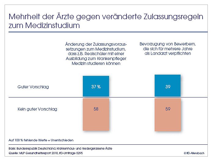 entgegenzuwirken, stoßen in der Ärzteschaft überwiegend auf Skepsis. 58 Prozent der Ärzte sprechen sich dagegen aus, dass in Zukunft z.B. auch Realschüler, die über eine Ausbildung im Bereich der Krankenpflege verfügen, zum Medizinstudium zugelassen werden. Ähnlich sind die Reaktionen auf den Vorschlag, bei der Vergabe von Studienplätzen angesichts des Ärztemangels speziell in ländlichen Regionen Bewerbern den Vorzug zu geben, die sich verpflichten, nach dem Studium mehrere Jahre als Landarzt zu arbeiten.