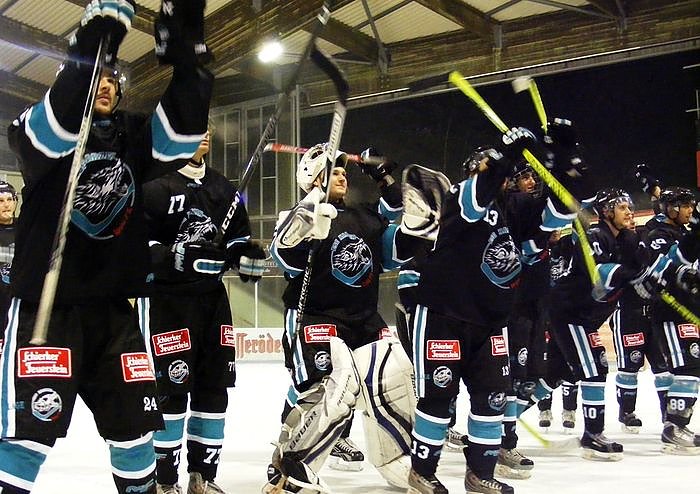 Autor: nnzKlares Ziel vor Augen: Die Mannschaft der Harzer Wölfe nach den beiden Heimspielen des Wochenendes gemeinsam mit den Fans sechs Punkte feiern
