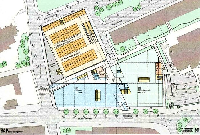 Hier handelt es sich um den Zuschnitt des künftigen Erdgeschosses, in dem unter anderen ein Verbrauchermarkt untergebracht werden soll.