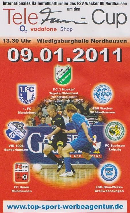 Alle Jahre wieder: Ein Echter Nordhäuser Fußballnachmittag erwartet die Fans am Sonntag in der Wiedigsburghalle. Das traditionelle internationale Hallenfußballturnier um den TeleFun-Cup wird am 9. Januar bereits zum 14. Male ausgetragen. Die Nordhäuser und speziell die Wacker-Fans warten seit der Premiere und dem damit verbundenen ersten und einzigen Turniersieg ihrer damaligen Regionalliga-Schützlinge auf einen Sieg unterm Dach. Vielleicht gelingt es der Truppe von Jens Eisenschmidt ja am Sonntag ab 13.30 Uhr in der Wiedigsburghalle endlich wieder einmal die Trophäe zu ergattern. Bevor es so weit ist müssen die Jungs um Kapitän Pistorius aber einige Siege gegen illustre Gegner einfahren. Mit von der Partie sind nämlich mit dem FC t Hoekje aus den Niederlanden ein Landesmeister im Hallenfußballspiel, der starke Regionalligist 1. FC Magdeburg, der NOFV-Oberligist FC Sachsen Leipzig, der benachbarte VfB Sangerhausen aus Sachsen-Anhalts Verbandsliga, Wackers Ligarivale FC Union Mühlhausen und als Exoten mit lautstarkem Anhang die LSG Blau-Weiss Großwechsungen.