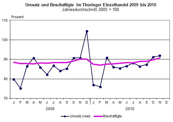 In den ersten elf Monaten des Jahres 2010 stieg der Umsatz im Thüringer Einzelhandel real um 0,9 Prozent und nominal um 2,0 Prozent. Damit erhöhten sich die Umsätze in Thüringen in diesem Zeitraum etwas moderater als im bundesdeutschen Durchschnitt (real: + 1,3 Prozent und nominal: + 2,5 Prozent). Die Zahl der Beschäftigten in den Thüringer Einzelhandelsbetrieben blieb gegenüber dem vergleichbaren Vorjahreszeitraum konstant.