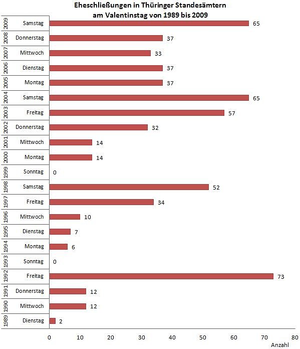 Nach Mitteilung des Thüringer Landesamtes für Statistik war das z. B. 1992, einem Freitag, mit 72 Eheschließungen der Fall oder im Jahr 2003, ebenfalls an einem Freitag, mit 57 Hochzeiten. In den Jahren 2004 und 2009 als der Valentinstag auf einen Samstag fiel, schlossen jeweils 65 Paare den Bund fürs Leben.