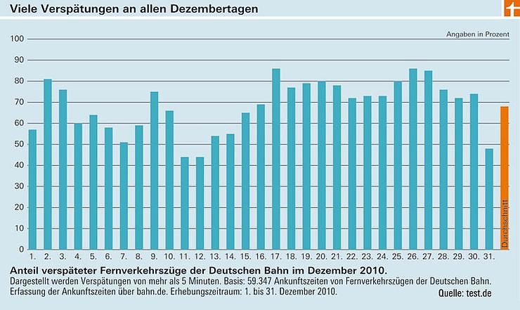 Wer im Dezember 2010 mit der Bahn reiste, brauchte Geduld. Schnee und Minusgrade hatten das ohnehin labile Streckennetz fast zum Kollaps gebracht. Doch die Bahn redete das Desaster klein. test.de belegt nun, dass das Ausmaß an Verspätungen größer war als bisher bekannt. An vielen Bahnhöfen kamen drei von vier ICE-Zügen zu spät.