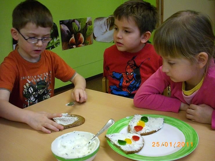 Ein Höhepunkt des Projektes im Kindergarten des Nordhäuser Jugendsozialwerks war ein gemeinsames gesundes Frühstück unter dem Motto: Lustige Ampel- Brote. Dazu rührten die Kinder Quark mit etwas Salz und Kräutern wie Schnittlauch, Dill und Petersilie an. Aus roten, gelben und grünen Paprika fertigten sie runde Ampellichter.
